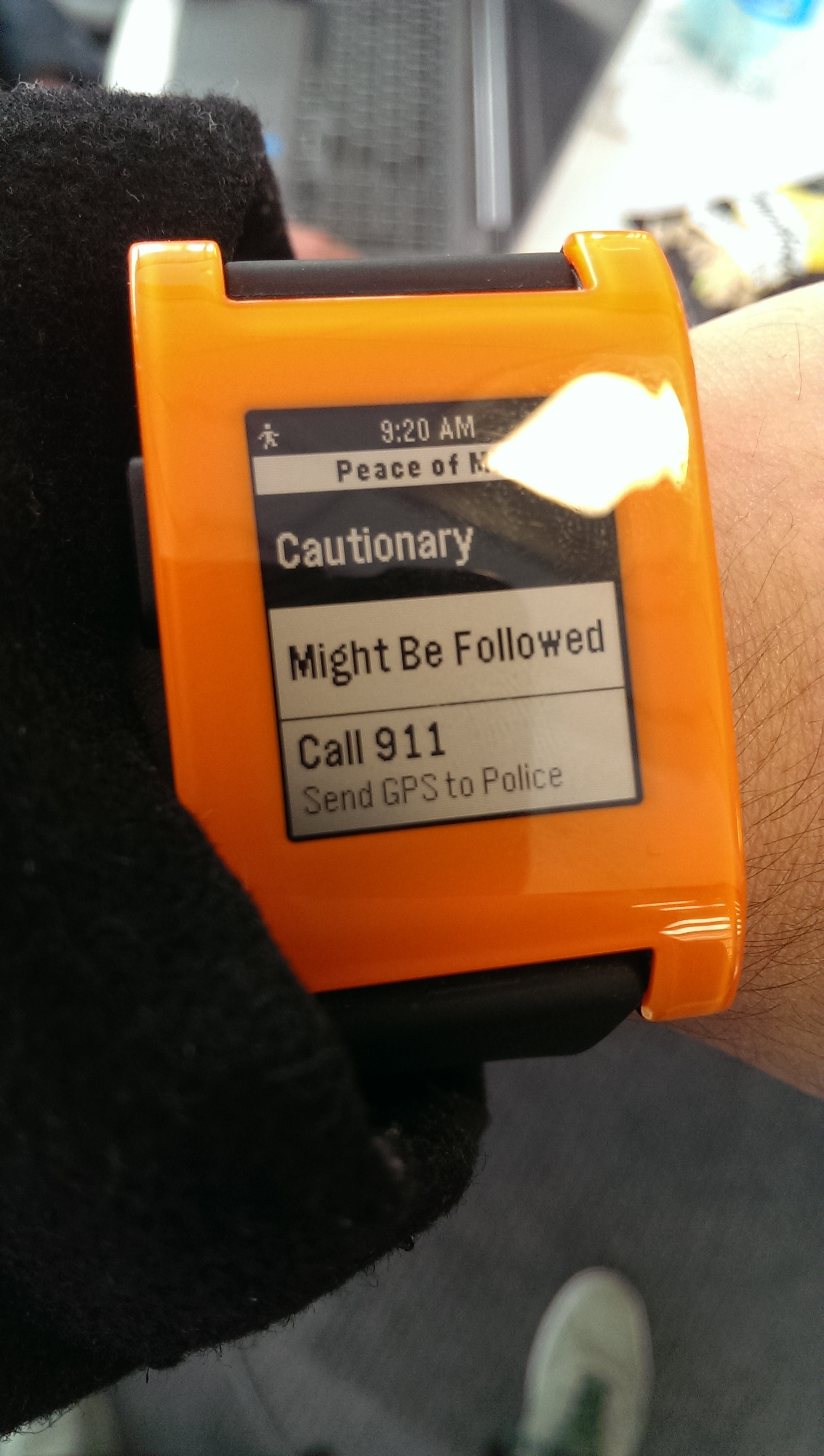 From your Pebble, you can choose several degrees of danger you feel. If you're walking late at night and it looks like someone is following you, there's an option for that. If something just doesn't seem right, there's an option for that. From there, you can escalate the degree of danger you feel depending on the situation. We even have an to call 911 immediately - all without the touch of your phone.