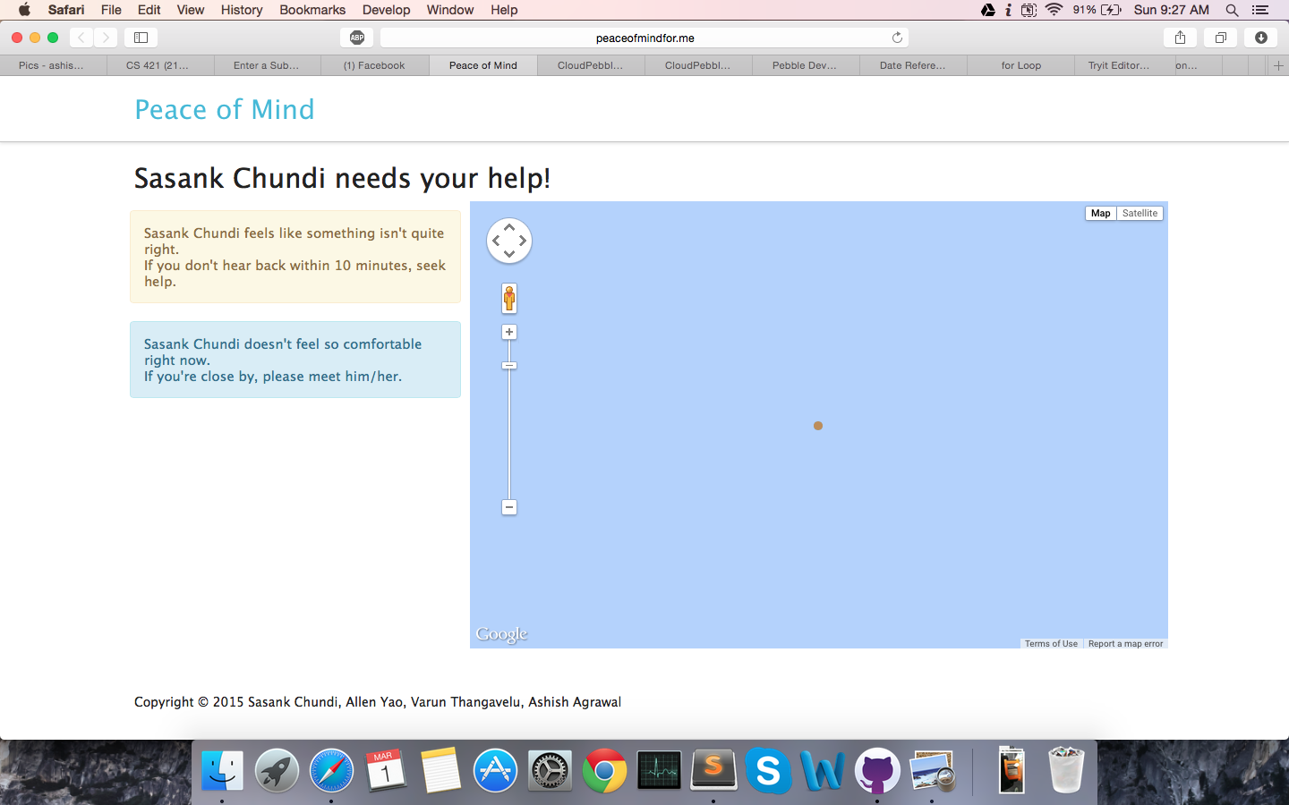 Many events around UIUC campus and throughout the world have inspired us to make this app. The concept is simple: notify your peers/friends/family when you think there might be danger using your Pebble. We track your location real-time and display it on a website so that your family/friends can see it.